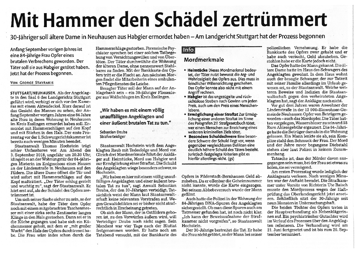 2019-07: Stuttgarter Zeitung, 16.07.2019: Mit Hammer Schädel zertrümmert / Stuttgarter Zeitung, 15.07.19: Angeklagter gesteht brutalen Raubmord
